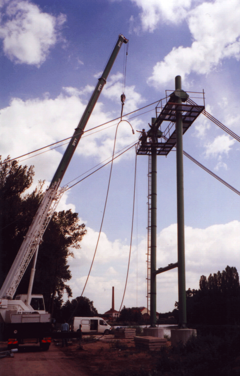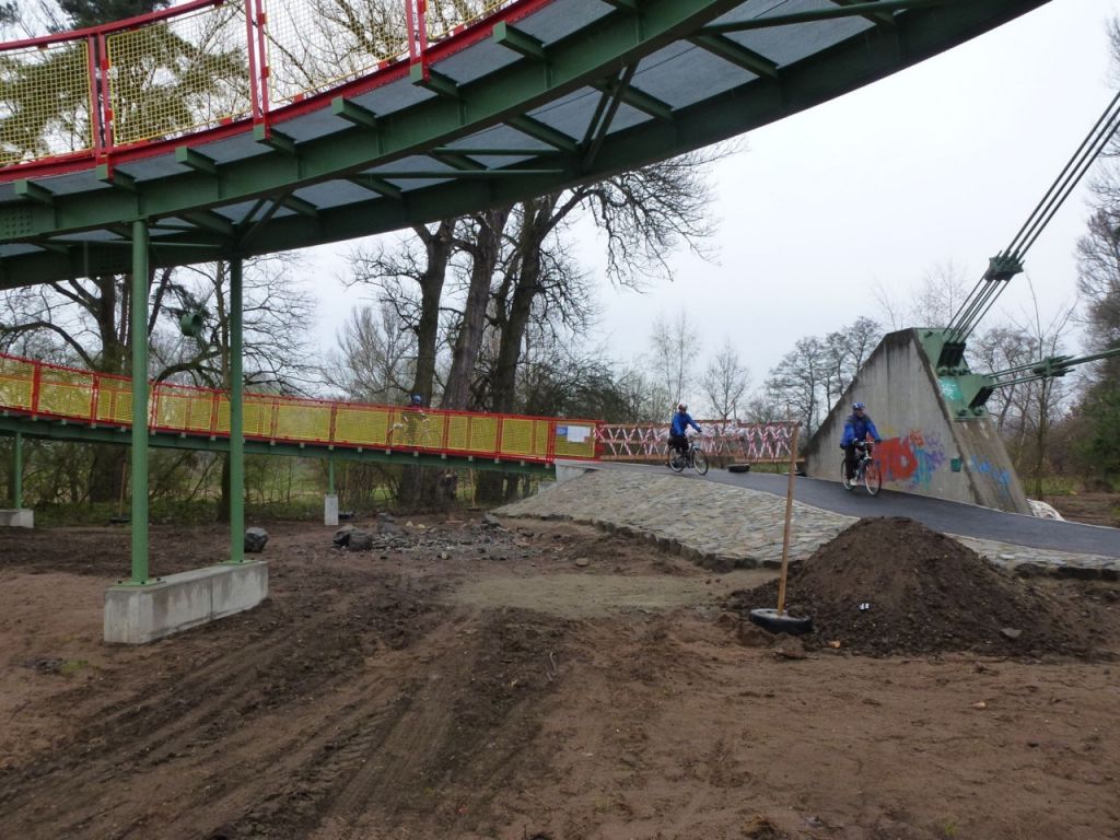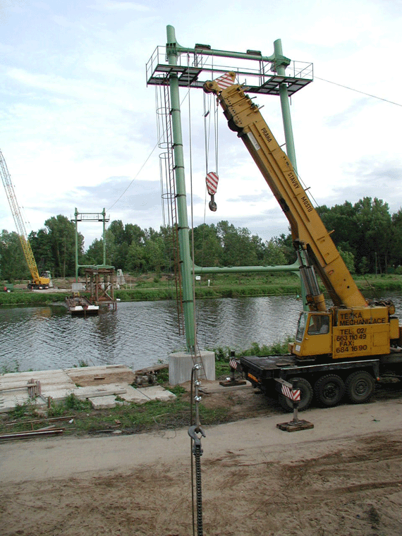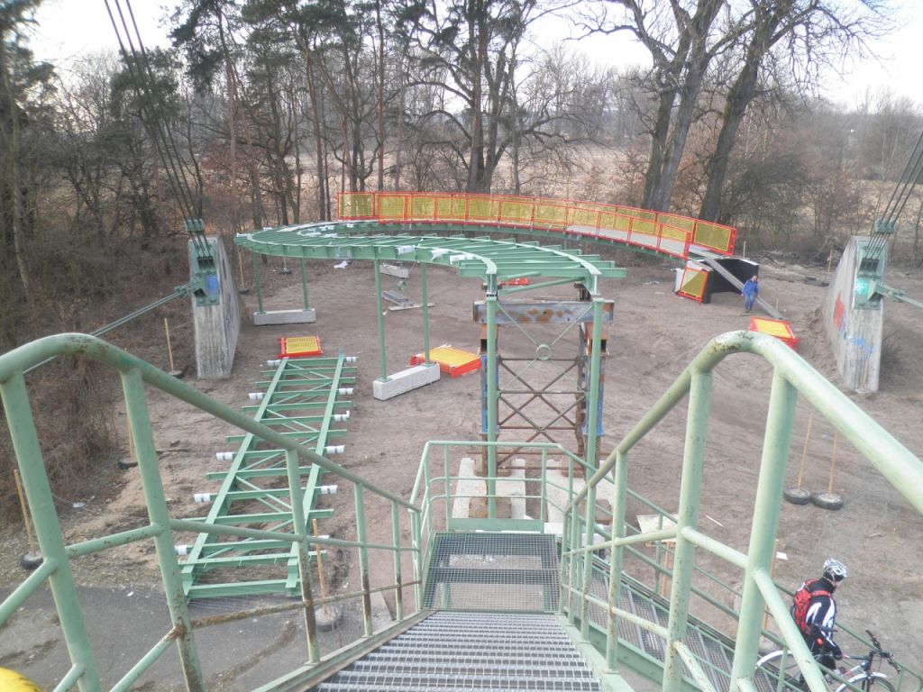Nosná konstrukce hlavního pole ze dvou visutých lan (3 ∅ 60 mm), kotvená na jednom konci na pylonech a na druhém konci na kotevních blocích. Na visutých lanech je zavěšena lehká ocelová mostovka z dvojice profilů IPE 360 mm v osové vzdálenosti 3,1 m. Příčníky potom tvoří profily IPE 200 mm a 140 mm. Povrch mostovky je z podlahových roštů. Stabilitu lávky zajišťují dvě předpjatá lana (2 ∅ 60 mm), spojená s nosnými lany a mostovkou závěsy. Stabilizující lana jsou kotvena do kotevních bloků a uprostřed rozpětí neposuvně připojena k mostovce. Celý systém tvoří předpjatou prostorovou konstrukci. Mostovka byla vyrobena z oceli S 235 J2G2. Pylony, koncovky a rektifikační členy byly vyrobeny z oceli S 355 J2G3, lana jsou z oceli o jmenovité pevnosti 1 370 MPa.