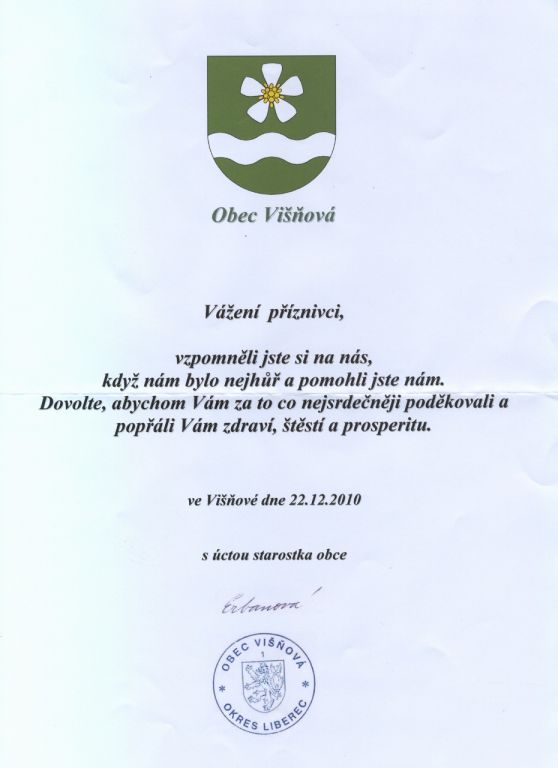 Poděkování za pomoc při hašení požáru lesa ve Dvorcích